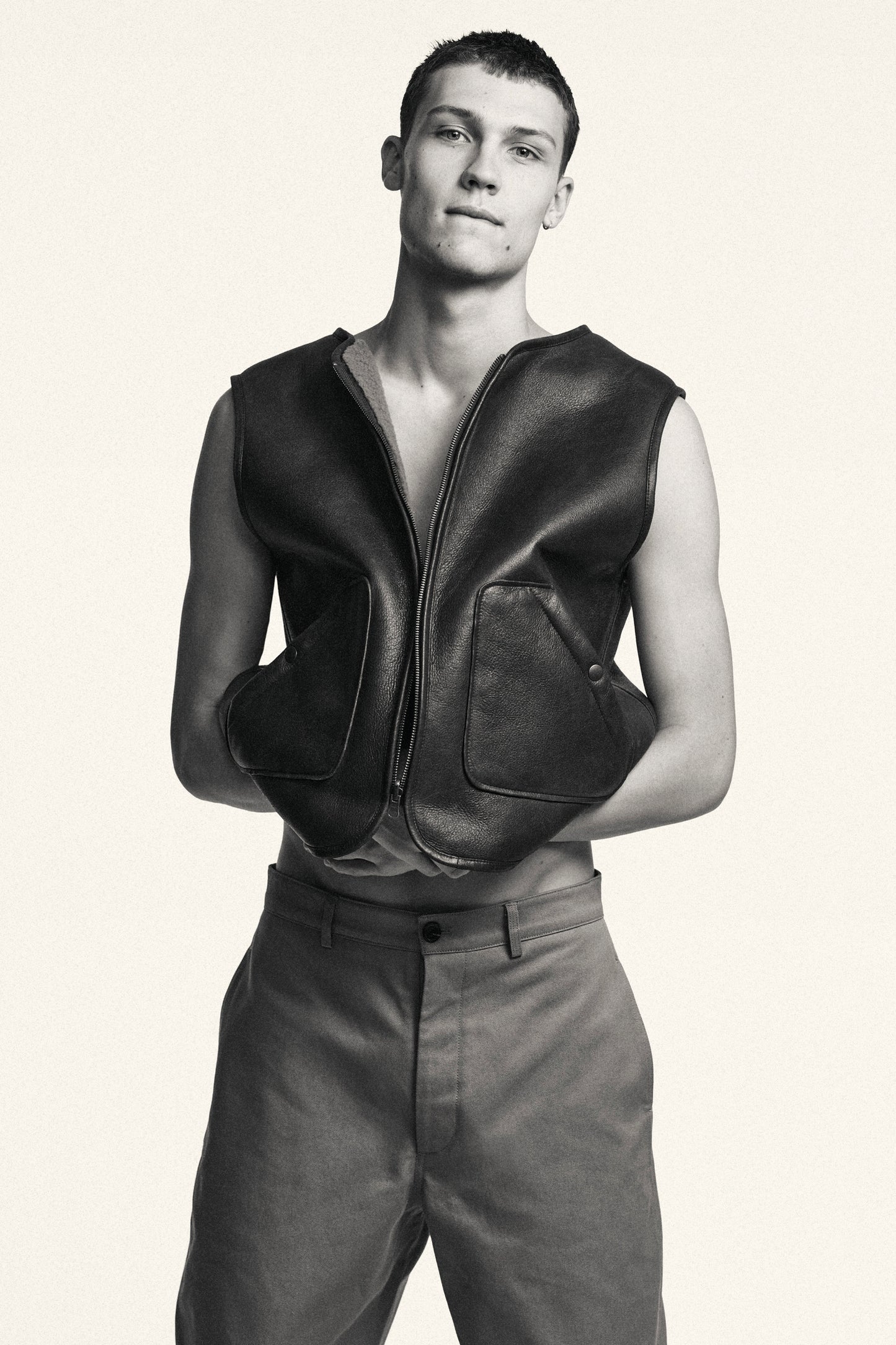 SAMO is a waistcoat in real wool skin. Reversible, it can be worn both on the smooth chocolate-coloured genuine leather side and on the more caramel brown buckle side. The cut is loose and straight, with two patch pockets on the leather side to give it a workwear feel.